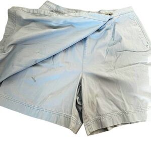 Eddie Bauer women’s skort in light blue. Size 16. Features a wrap front design with button closure, two front pockets, and two back pockets. Made from 100% cotton for breathable comfort.