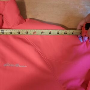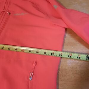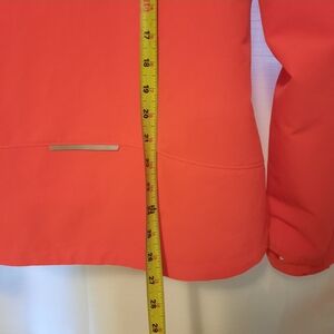Red jacket with zip closure. Features side pockets and high collar. Perfect for skiing.