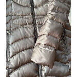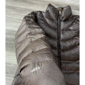 No hood included Stay warm and stylish with this Eddie Bauer women's puffer jacket! Crafted from softshell polyester fabric with a solid brown color, this mid-length coat features a full zip closure and is insulated with cozy down material. The jacket is perfect for outdoor activities during the fall and winter seasons and has a classic design that will never go out of style.