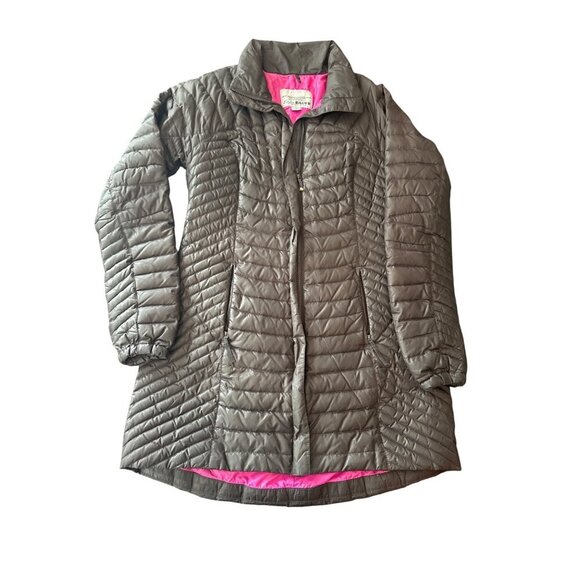 This Eddie Bauer down jacket offers warmth with premium European goose down insulation. Designed with a sleek black exterior and contrasting pink lining, it provides both style and comfort. The jacket features a durable zipper closure and is ideal for cold weather.