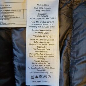 - Material: Shell 100% Polyester, Lining 100% Polyester, Insulation 80% Down and 20% Waterfowl Feathers