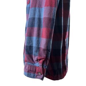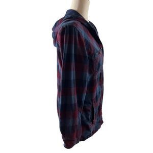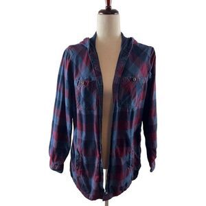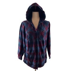 Eddie Bauer Women's Flannel Checkered Hooded Button Up Shacket Large Purple Blue