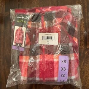 Keywords: Eddie Bauer, womens fleece pullover, quarter zip, red plaid, extra small, XS, fleece top, casual wear, outdoor clothing, plaid fleece, long sleeve, womens top, winter apparel, cozy fleece