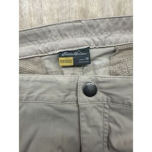 The product is a pair of Eddie Bauer Women's Hiking Pants in size 18, designed for outdoor activities. These beige cargo-style pants feature convertible functionality, allowing them to be worn as shorts by zipping off the lower leg portion. The pants are from the Travex line, indicating they are likely made for durability and performance during outdoor adventures. With multiple pockets for storage, these versatile pants are in excellent used condition (EUC) and are ideal for hiking or other outdoor activities.