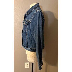 This denim/jean jacket is from Eddie Bauer in a misses size small. Blue in color. Unlined, made of pure cotton. Machine washable. Classic style with 4 front pockets.