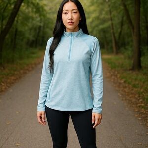 The image shows an Eddie Bauer women's size L, 1/4 zip pullover, made of fleece material. It features a light blue color scheme with a heathered texture on the main body and solid light blue accents on the shoulders and zipper area. The pullover has long sleeves, a mock neck, and a small zippered pocket on the left side. It is designed for layering and could be suitable for outdoor activities or casual wear.