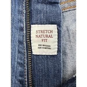 The product is a pair of Eddie Bauer Women's Jeans in size 14R with a stretch natural fit and straight leg style. These classic preppy jeans feature a mid-rise waist, 5-pocket design, and are made from a comfortable cotton-spandex blend fabric. With a timeless solid blue color, these jeans are easy to care for and perfect for all seasons, suitable for various occasions from casual to preppy. The design accents include a button and logo detailing, reflecting a classic and hipster style. Ideal for those looking for a comfortable and versatile addition to their wardrobe.
