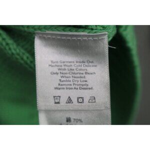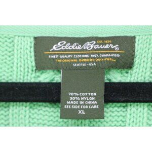 This is a Eddie Bauer Long Sleeve Chunky Cable Knit Fisherman Sweater that is a size XL. It is Kelly Green and is 70% Cotton and 30% Nylon. Laying flat, it measures: Armpit to armpit-19" and the length is 29". It has a lot of stretch. In great condition.