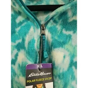 The Eddie Bauer Women's Long Sleeve Polar Fleece Quarter Zip Pullover XXL is a stylish and comfortable sweater perfect for casual occasions. Made from 100% recycled polyester fleece fabric, it offers warmth and breathability. The pullover features a classic fit, collared neckline, and long sleeves, making it a versatile choice for all seasons. In a beautiful turq leaf green color, this sweater combines modern design with quality craftsmanship from the trusted brand Eddie Bauer. Easy to care for with machine washable instructions, it is a must-have addition to any woman's wardrobe.