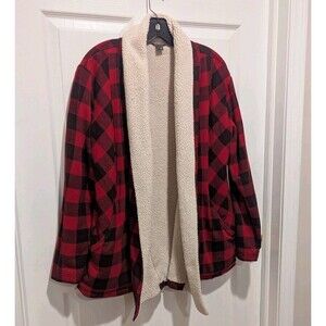 Eddie Bauer Women’s Medium Red Buffalo Plaid Open Front Sherpa Lined Cardigan