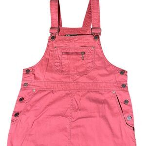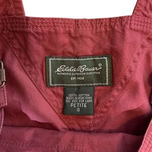 Keywords: Eddie Bauer, petite dress, overalls, pink dress, spring fashion, casual wear, adjustable straps, cotton dress, women's clothing, short dress, button closure, multiple pockets, machine washable, pre-owned.