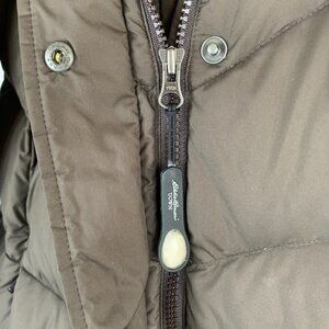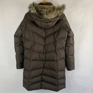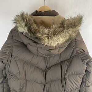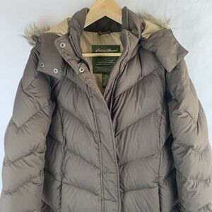 Eddie Bauer Womens Puffer Coat Quilted Goose Down Hooded Fur Jacket Medium Brown