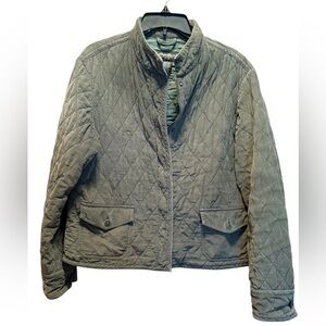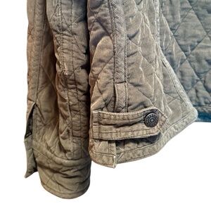Women’s Army Green Corduroy Quilted Jacket by Eddie Bauer. This piece is well made and has lots of life left. Broken in vintage vibe is perfect for fall. Two front flap pockets with brass button closure. Zipper front with flap that snaps shut to keep weather out. All zippers and snaps are functional. Mock neck collar. Sleeves have brass button closure. Side bottom hem has accent brass button and strap with side slit. Princess seam back. Jacket is clean and shoes no signs of stains. Color: Army Green. Size XL. 100% Cotton ( Shell, body lining) 100% Polyester Insulation and Sleeve lining. There are some worn spots shown in photos. Mostly on sleeve elbows and along button closure in front pocket. His is definitely a vintage vibe fall jacket. Pet free smoke free environment. Measurements laying flat Armpit to armpit 25” Waist 22” Hip hem bottom 23” Shoulder to hem 24” Sleeve 25” Cuff opening 5” Eddie Bauer Corduroy jacket Zipper and snap front Quilted Jacket Style 0224 Eddie Bauer Quilted Corduroy Jacket