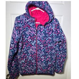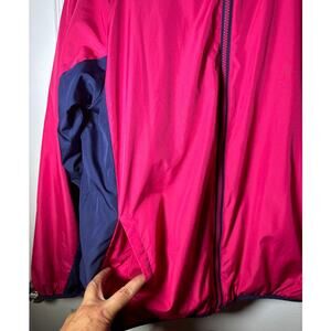 Eddie Bauer Reversible women's windbreaker fleece Jacket Size Small. Pink and blue Rainbreaker on one , Multi colored blue Fleece on other size. Zip clousure.