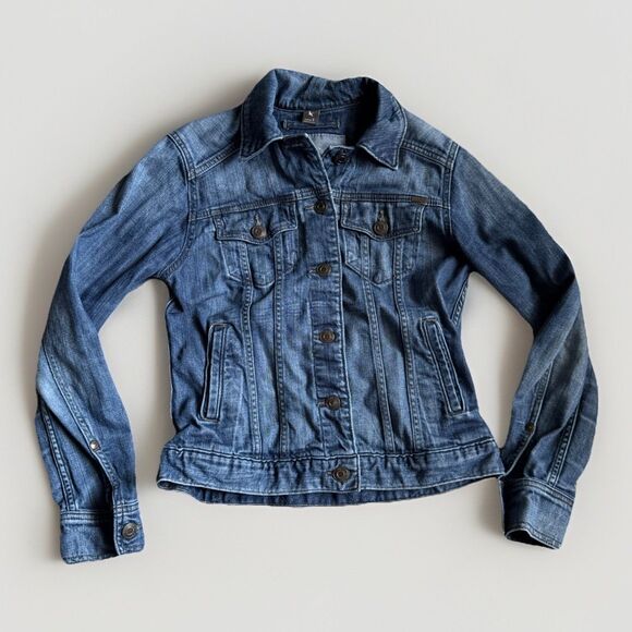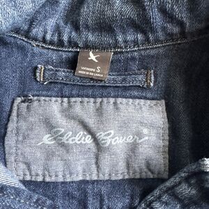 The Eddie Bauer Women's Small Button Down Jean Denim Jacket made from durable denim fabric with long sleeves. The iconic Eddie Bauer brand ensures quality and reliability.