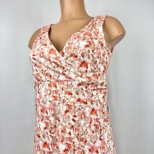 The Eddie Bauer Women's Sleeveless Stretch Mini Dress in size S is a versatile and stylish option for outdoor and athletic activities. The dress features a geometric coral and tan color scheme, a v-neck design, and a lightweight, stretchy material for comfort and ease of movement. Perfect for beach days, casual outings, or classic styling, this short dress is a must-have addition to any woman's wardrobe.