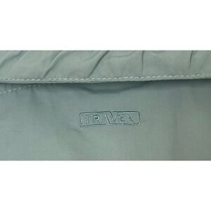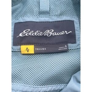 This is a preowned Woman's Eddie Bauer Travex Vest in an Aqua Blue Green color in a size small. This versatile vest can be used hiking, mountain climbing, fishing or camping. It is a full zip jacket with multiple snap pockets and an external zippered pocket. The outside is made of 100% nylon and the lining is 100% polyester in India. The collar can be pulled up and zipped completely and has a cinch cord.