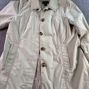 Keywords: Eddie Bauer trench coat, women's trench coat, lightweight jacket, beige trench coat, cotton blend jacket, nylon blend jacket, size XL trench coat, casual coat, spring jacket, fall jacket, outerwear, ladies coat, classic trench, travel jacket
