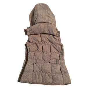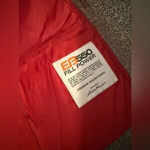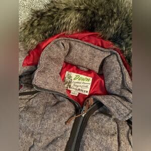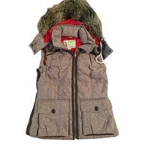 Stylish Eddie Bauer vest with faux fur hood. Features a brown exterior and red lining. Perfect for layering.