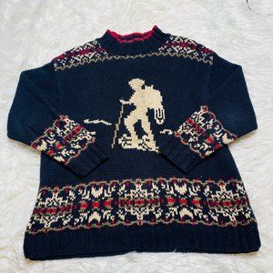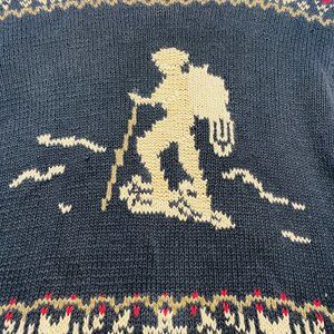 If your an outdoor enthusiast this sweater is for you! This sweater is hand knit and recently dry cleaned. I've never seen this motif before. ? missing embellishment by the walking stick appears to be glued but, I was going to keep this sweater, I'd conceal with a permanent marker but full disclosure here.