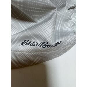 Eddie Bauer Women’s Weatheredge Rain Jacket Sz XL Gray White Hooded Full Zip Snap Mesh Lined Hiking Outdoor Gorpcore