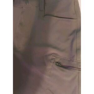 These Eddie Bauer Workwear Shorts for men in size 38 are styled in army green with a cargo design. They are made of a blend of polyester and spandex, providing a regular fit suitable for travel, casual wear, and work situations. The shorts feature a 38-inch waist size, perfect for a comfortable and practical everyday look with an army theme.