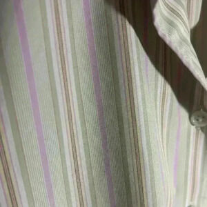 Green/cream/Purple striped button up shirt. Very gently pressed-worn condition. Near vintage.