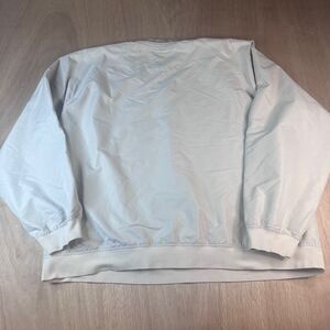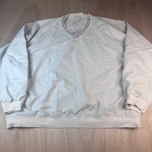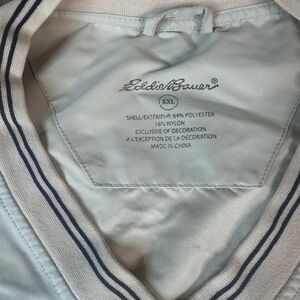 Classic Eddie Bauer pullover windbreaker in size XXL. Light beige with elastic cuffs and hem, and a V-neckline with striped trim. Lightweight and easy to layer, perfect for golf, travel, or casual outdoor wear.