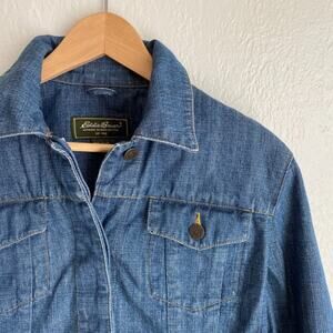 Eddie Bauer jean jacket, Y2K denim jacket, vintage denim coat, women’s medium jean jacket, 2000s fashion, classic blue denim, minimalist outerwear, utility jacket, timeless layering piece, everyday denim, retro jean jacket, structured denim jacket, transitional weather jacket, casual chic outerwear, cotton jean jacket