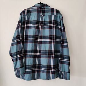 Details: blue plaid long sleeve button front flannel shirt