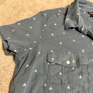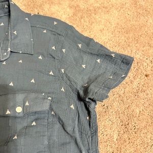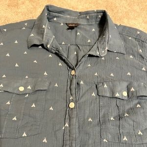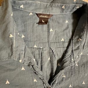 Women’s button-up short-sleeve collared blue shirt by Eddie Bauer. Size large. Two front pockets. 100% cotton.