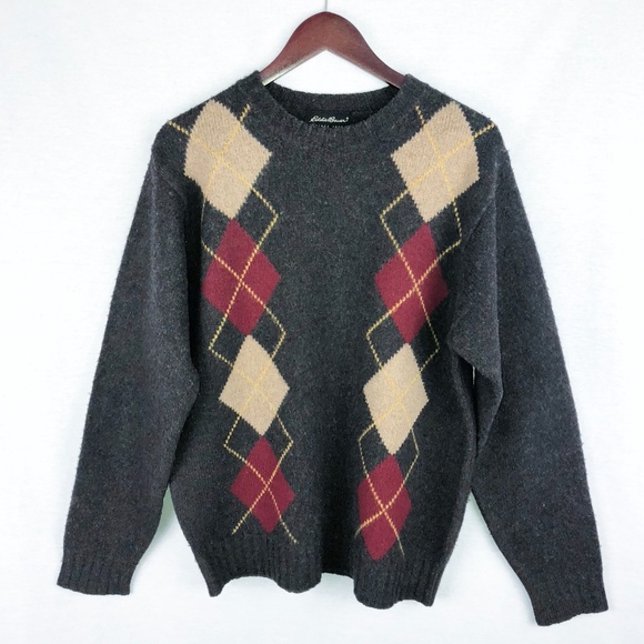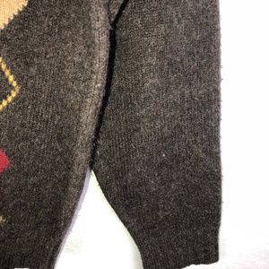 Nice brown lambswool sweater by Eddie Bauer. Features a light tan and deep red argyle print down the front. Good used condition. There is some piling to this sweater, as seen in the close up photos.