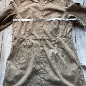 Embrace vintage charm with this Eddie Bauer tan floral corduroy snap-button dress. Featuring a soft corduroy fabric adorned with a delicate floral print, this dress exudes a rustic, retro vibe. The snap-button front adds practicality and style, making it perfect for casual outings or layering with your favorite accessories.