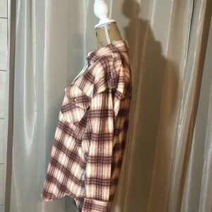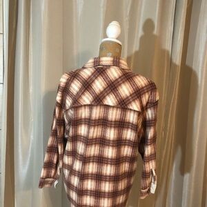 Eddie Bauer flannel. Petite small. Oversized fit. Colors are pink,cream, and maroon