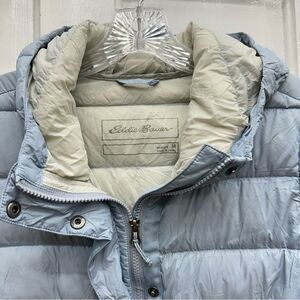 Eddie Bauer hooded down puffer jacket women's medium mid upper thigh length. pit to pit is 21 shoulder to hem 31.5. packable