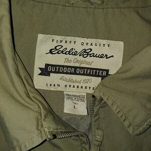 Eddie bauer jacket desert cloth tan khaki size L with 2 stains one on the back collar and another on the sleeve see pictures for reference other than that in great shape