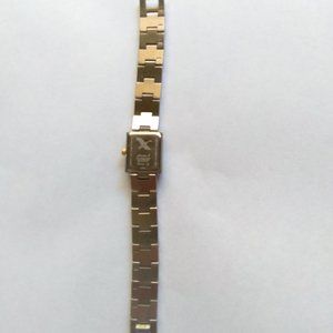 Eddie Bauer ladies watch, quartz movement, runs excellent, white dial with gold and silver case and band, 7 inches long.