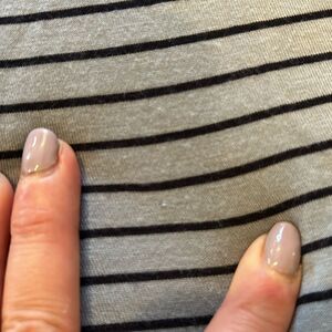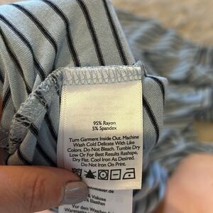 Eddie Bauer women’s light blue and black stripped soft long sleeve vneck rayon stretch shirt size xs, tiny snag on front of shirt as shown in picture