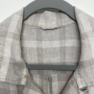 Eddie Bauer linen cotton Plaid gray tan short sleeve button down shirt Medium