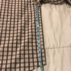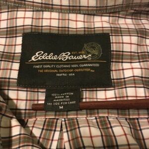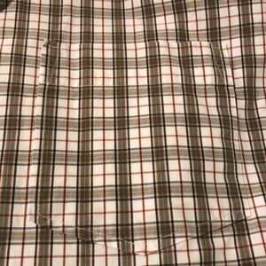 100% cotton long sleeve shirt in plaid. Colors are off white, olive green, burnt orange and navy blue. Great color pattern with one chest pocket. Gently worn.