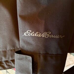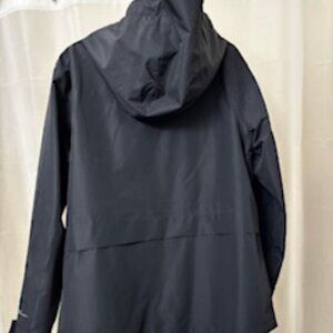 Light weight rain jacket with attached hood. Snap closure. Two front pockets. Velcro cufff closure. with logo on cuffs. Perfect for taking a walk in the fall or spring and stay dry when it rains. Hip length.