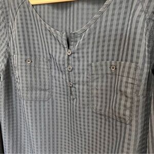 Gorgeous blue blouse with lattice pattern fabric. Round neck and front buttons. Perfect for work or with shorts for the weekend. Very lightweight. Great neutral versatile piece.