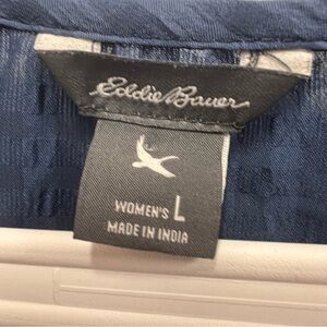 Eddie Bauer semi-sheer blue patterned blouse with front buttons size large