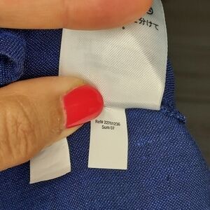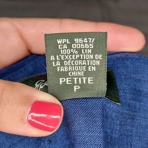 Eddie Bauer shirt in navy blue, size S Petite. Button up front, collar, sleeveless, open crochet details shoulder & alongside buttons, shirt tail hem. Linen. Approx: Chest flat armpit to armpit 18.5", shoulder seam to hem 24" EUC, smoke free home.