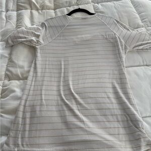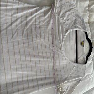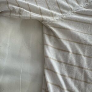 Size large- short sleeved- white and tan. Please see photos for sleeve length and wearing (pilling) this is a great shirt with lots of wear left.