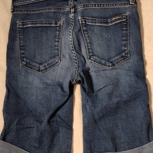 Style: cuffed Bermuda style shorts , hits mid thigh area. Stretchy denim, snug fit.