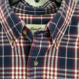 Eddie Bauer thicker woven long sleeve button up wine/navy/white plaid mens shirt
