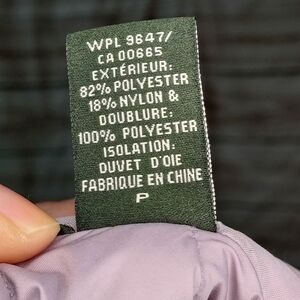 Quilted styling, zip up closure, side pockets with zip closure, snap adjustable tab rear waist. Nylon, polyester, goose down.