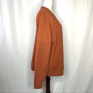 Eddie Bauer tweed wool and camel blend v-neck cabled sweater with ribbed detail under arms and down side seams. Warm brown color. Size medium.