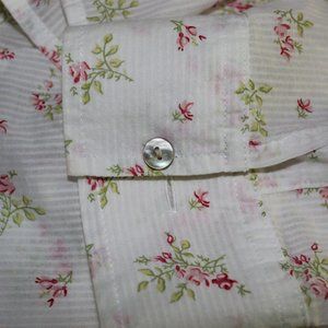 Bright white button-up shirt with small pink flowers scattered design has white pearlescent buttons size extra large measurements and photos comes with an extra button NWOT condition no stains rips or pulled threads
